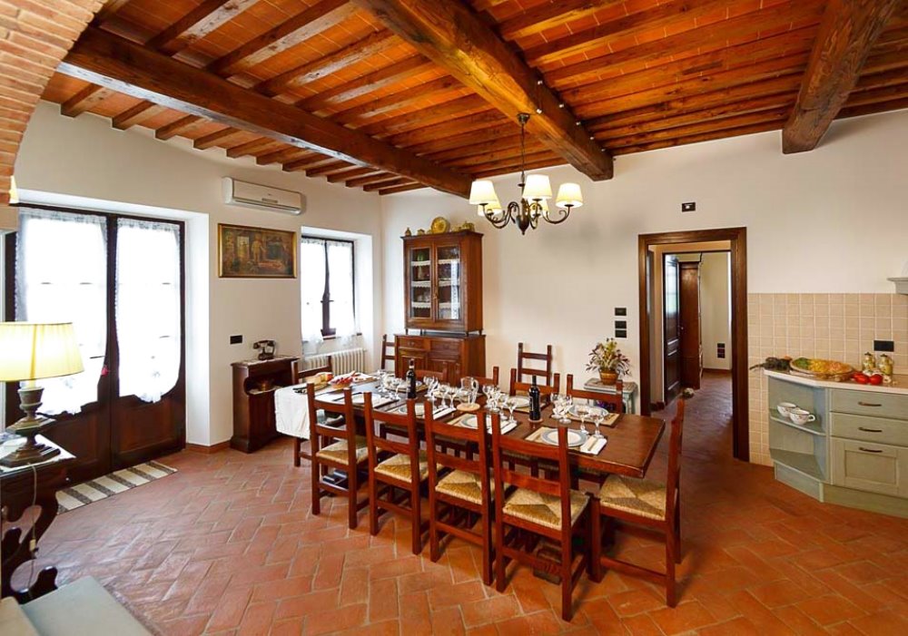 La Ginestra presenta una ampia zona giorno suddivisa da un particolare arco in pietra e mattoni, che separa il salotto dalla sala da pranzo.